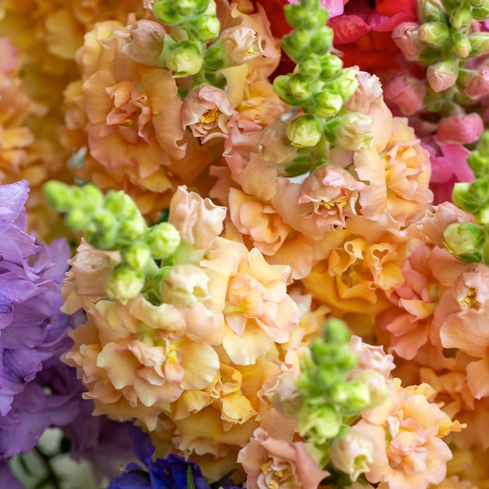 A lovely and colorful annual, these blooms add height and drama while looking stunning in a vase. The charming, frilly flowers of the snapdragon grow in a wide array of happy hues and are non-toxic to pets. Their whimsical shape adds a playful element that draws the eye.