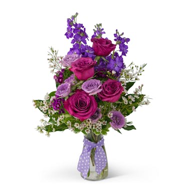There is just something majestic about A Queen's Beauty. Just like a true queen, this bouquet blends both grace and strength in its royal hues of purple. Just above a purple ribbon, blooms abound. Richly colored roses, sweet william, waxflower, and purple stock are featured on a spray of deluxe greenery. She will feel like she just stepped into a fairy tale when she receives this hand-delivered gift. Approximately 17" H x 9" W