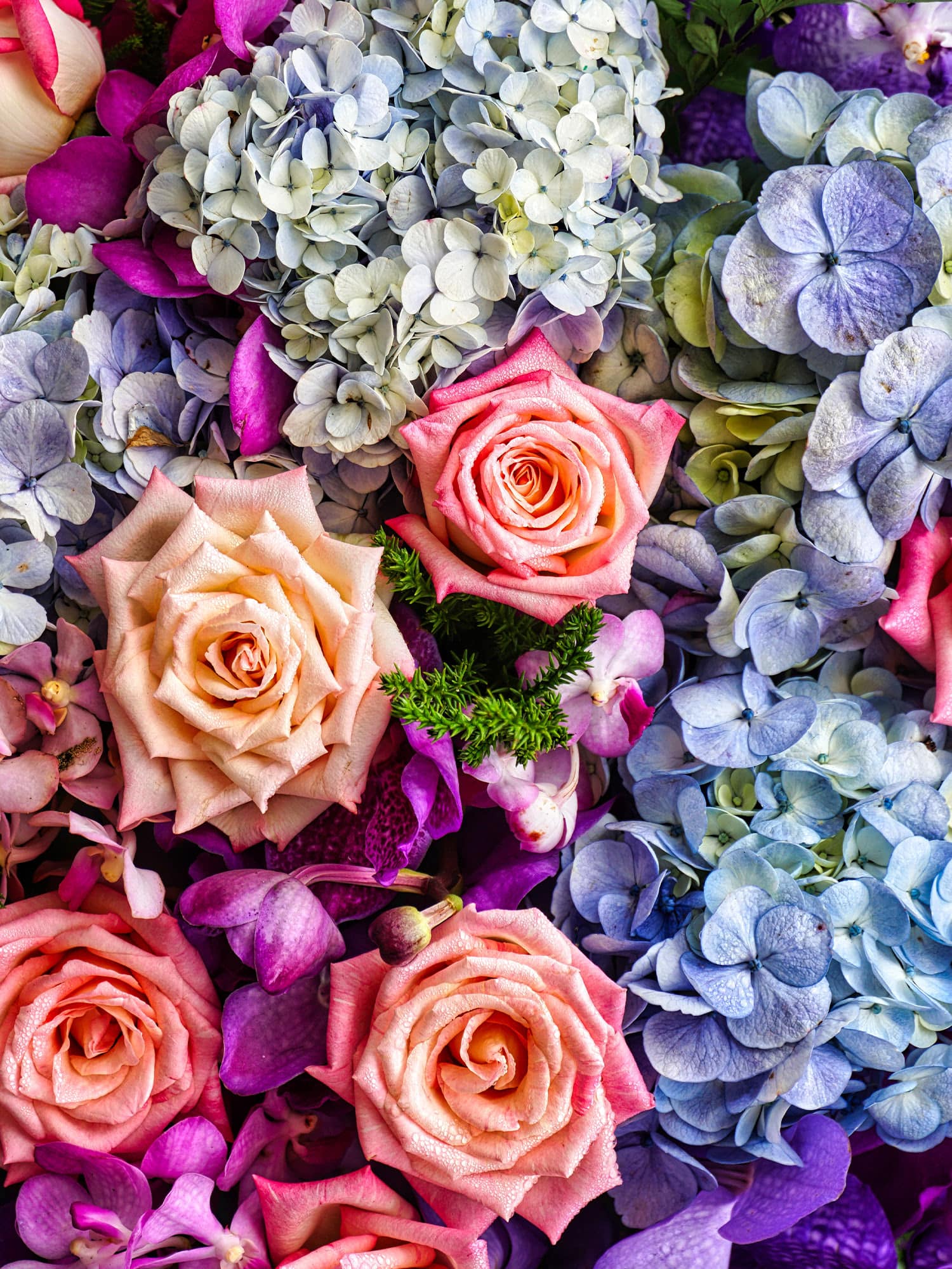 • Cornflower Blue — A soft sky-toned blue that feels like open summer skies and long afternoons with nowhere to be. It’s reminiscent of porch swings, linen curtains moving in the wind, and the pale blue horizon on a clear day. Cornflower blue flowers add a graceful and nostalgic touch to summer designs. Delphinium and blue hydrangeas capture this shade beautifully, lending summer arrangements an airy elegance.