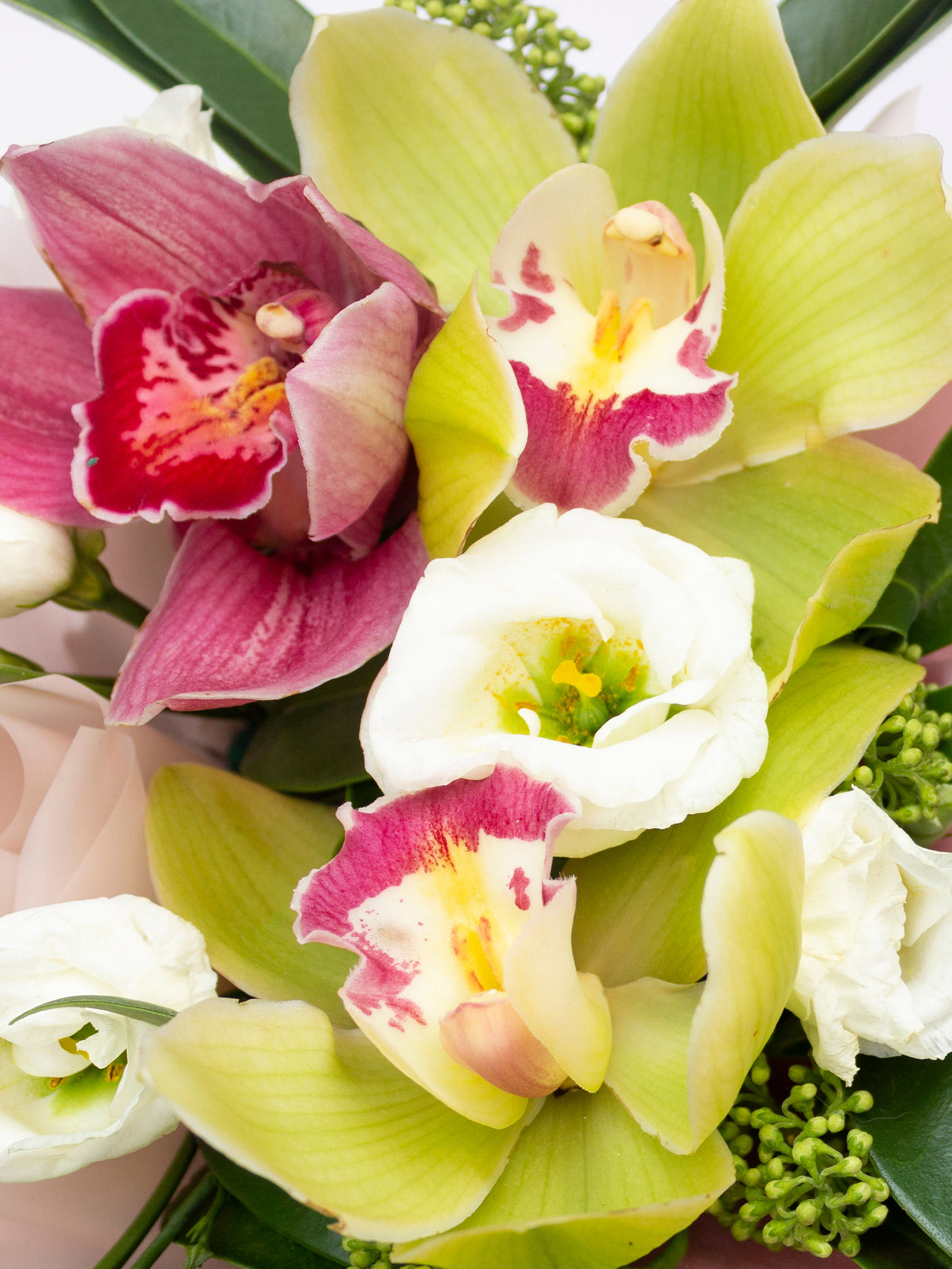 • Orchids — Smooth and velvety with gently curved petals, orchids are beloved, refined, and luxe. They offer soft dimension yet new vibrancy and symbolism through multicolored petal tones. Their graceful symmetry and elevated form bring rich tropical beauty to the season, pairing beautifully with glossy greens, sculptural stems, and brighter summer florals. In shades of pink, white, purple, orange, yellow, and green, orchids add a luminous layer of color that’s expressive and flawlessly suited to summer hosting.